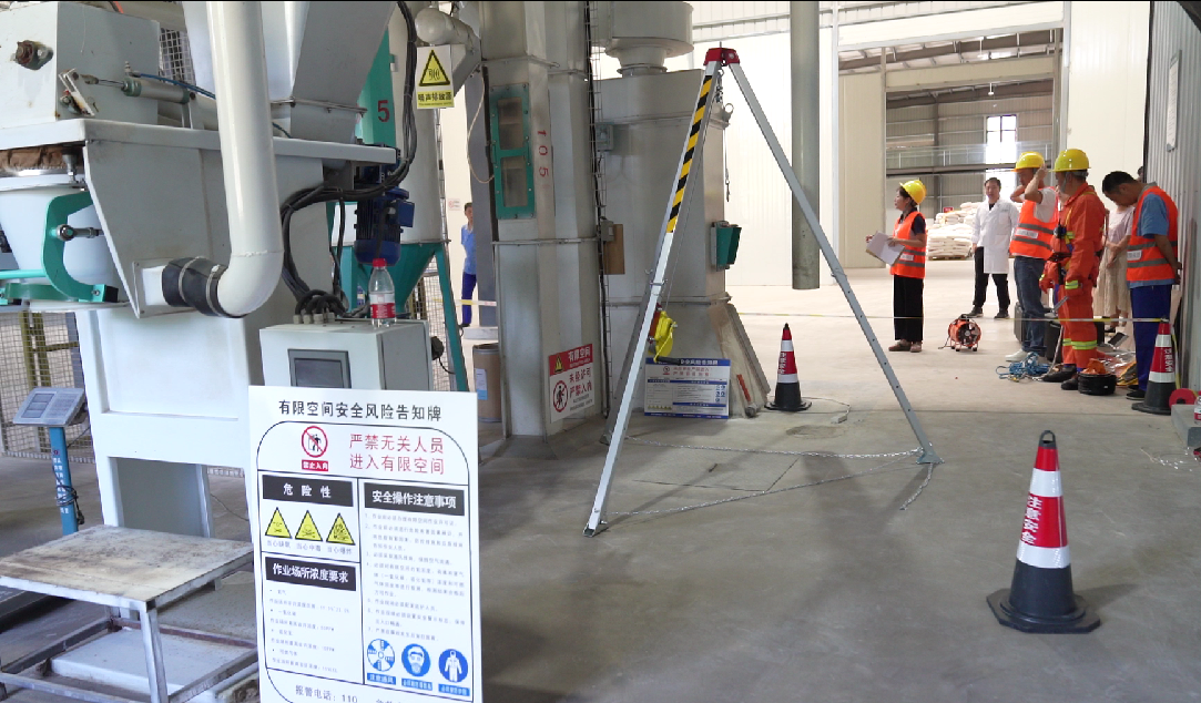本次演練的有限空間位于混合型飼料添加劑生產(chǎn)車間的地下,現(xiàn)場作業(yè)組、檢測組、救援組、監(jiān)護(hù)組等參演人員,攜各類作業(yè)設(shè)備裝備按規(guī)范流程開展準(zhǔn)備工作。